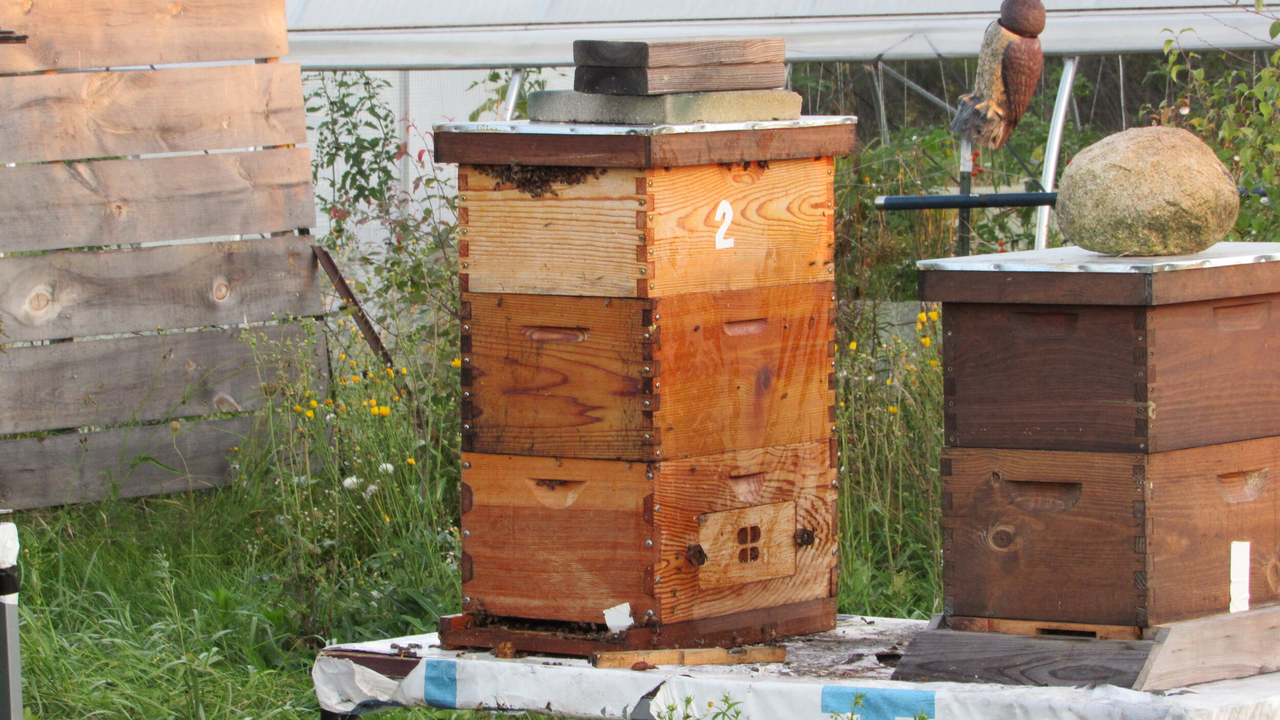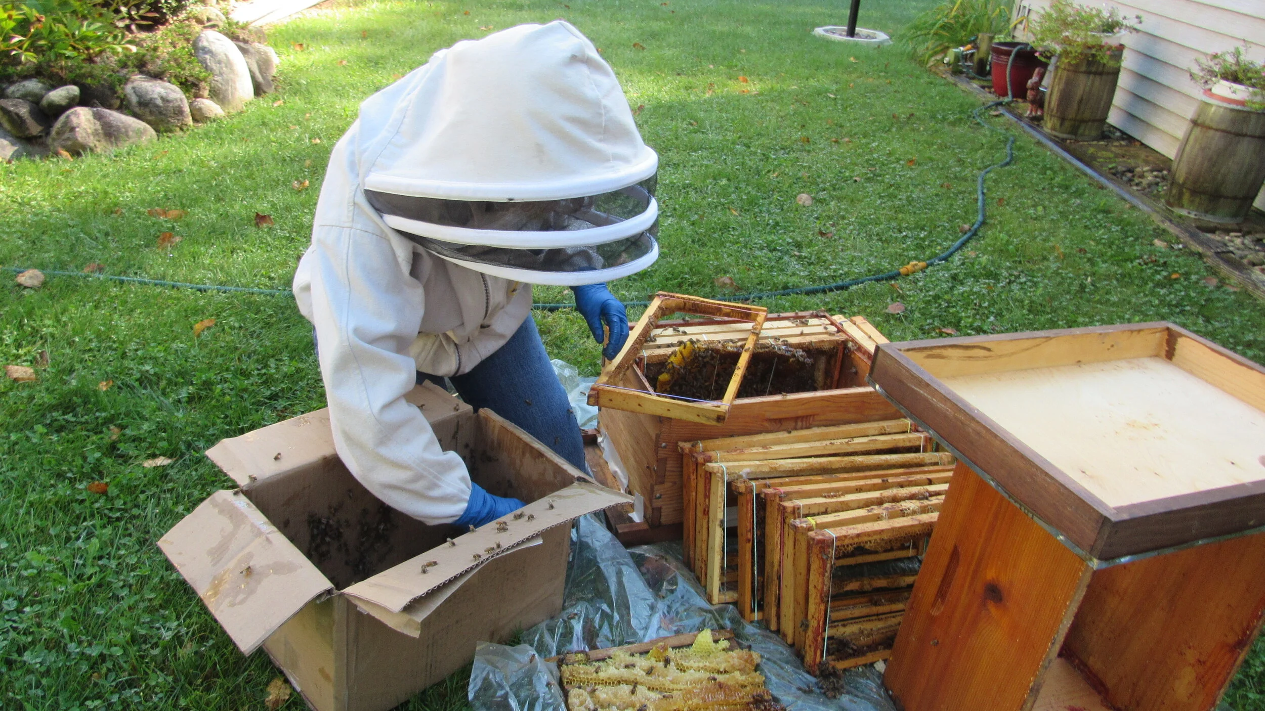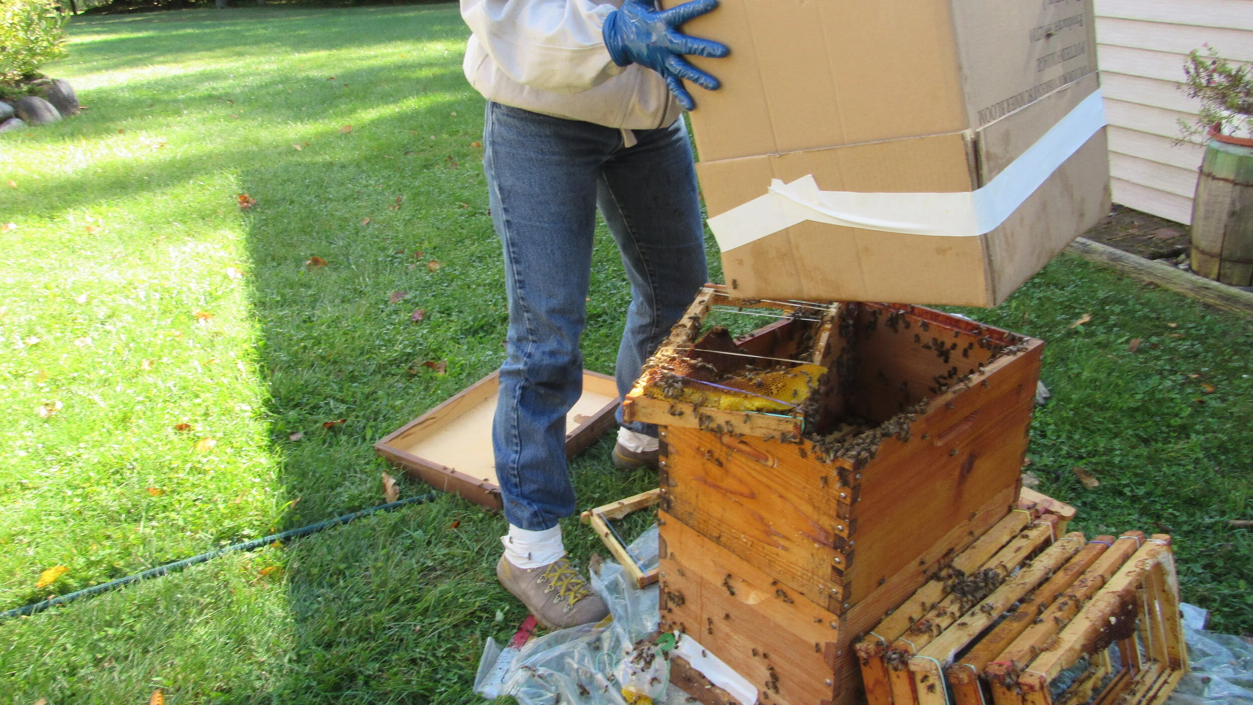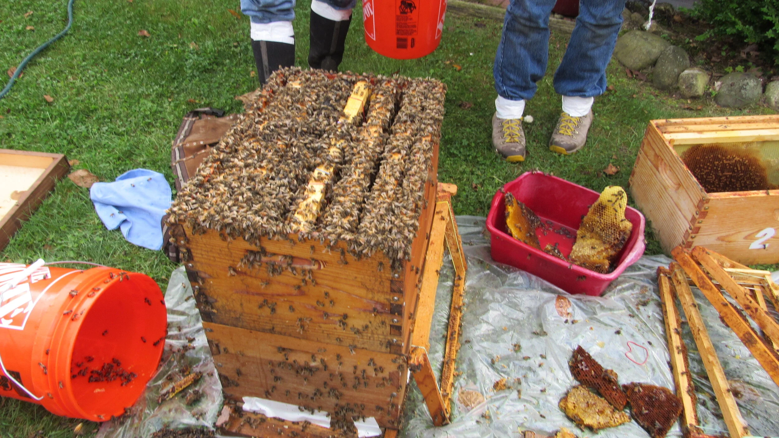 There were a lot of honeybees in the roof, this is 2 boxes overflowing, so we added a third box with some of their honey and pollen frames