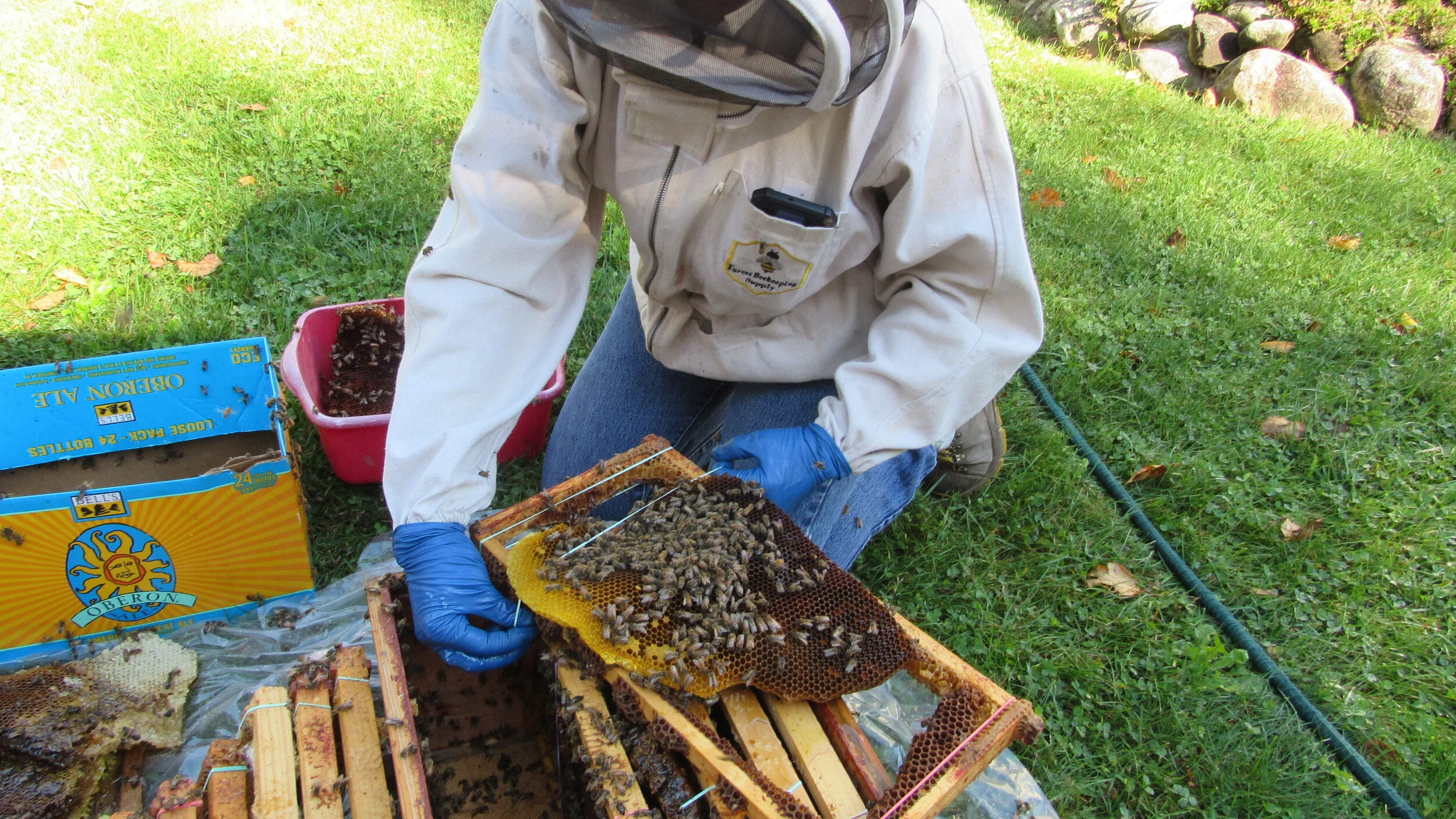 The comb pieces were rubberbanded to frames and placed in a hive box