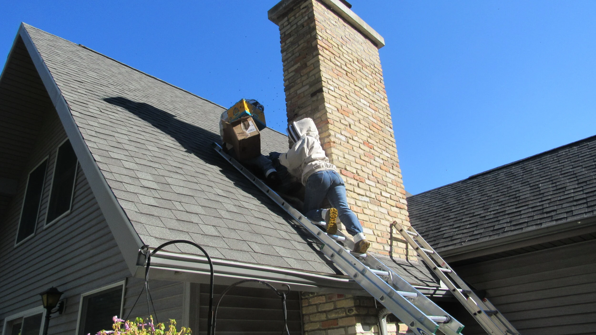 09/20/2021 - Last week we had our hardest honeybee extraction on a steep roof in the saddle by a chimney. Normally we don’t do any removals involving cutting of roofing/house materials being removed. But in this special case the owner gave us approval to do what we needed to save the honeybees, and prearranged with her roofer do do the repairs after we relocated the honeybees. It took nearly 4 hours from start to finish and then we went back just before dark to get the bees that were out foraging during the day and clustered where the previous entrance was.